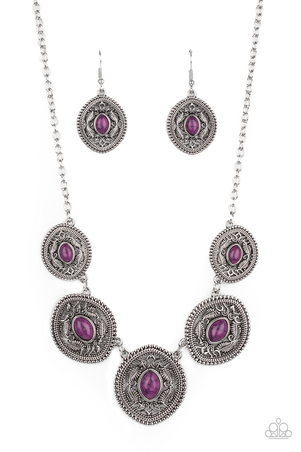Dainty purple stones dot the centers of leafy silver filigree filled frames that delicately connect below the collar, creating a colorfully earthy look. Features an adjustable clasp closure.