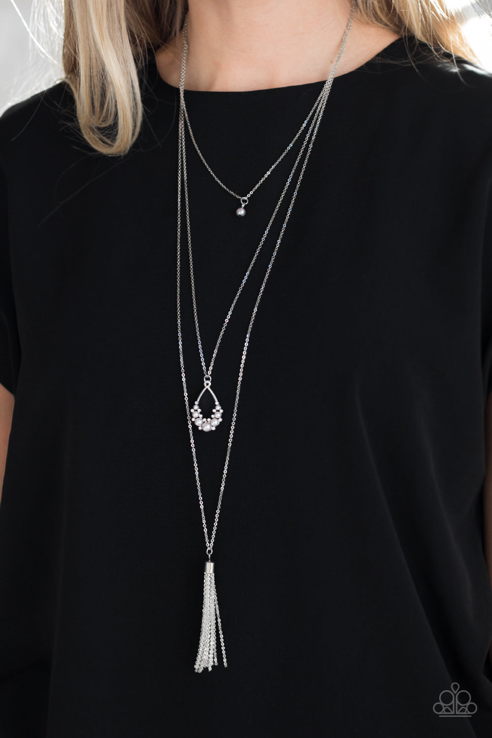 A solitaire silver pearl swings from the uppermost chain, giving way to a teardrop pendant and shimmery silver chain tassel. Dainty white rhinestones and silver pearls collect at the bottom of the centermost pendant for a glamorous finish. Features an adjustable clasp closure.