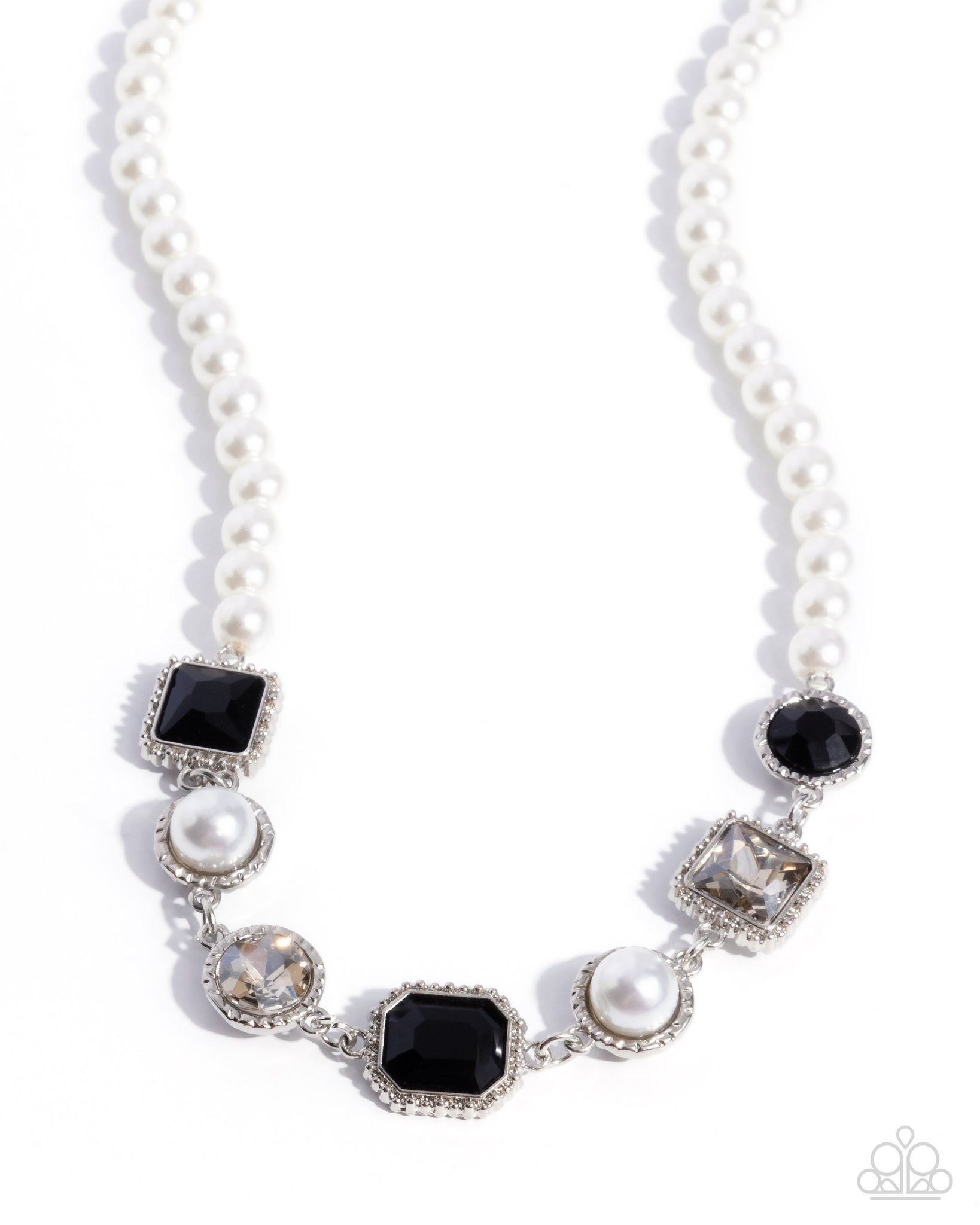 Dazzling black and smoky rhinestones, in round, square, and emerald-cuts, fall along the collar in an alternating pattern beside glossy white pearls. Each glittery element is bordered by silver studs or hammered texture, giving way from a glossy strand of white pearls, further amplifying and maximizing its impact. Features an adjustable clasp closure.