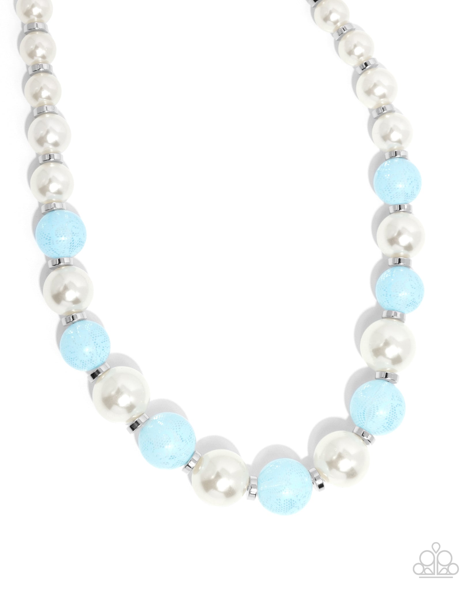 Infused along an invisible string, a collection of Winter Sky lace-embellished beads alternate with glossy white pearls and silver discs below the neckline for a ladylike luminescent display. Features an adjustable clasp closure.