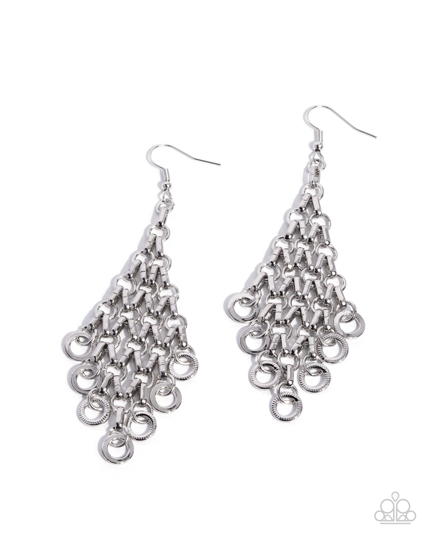 Modeled after chainmail, a collection of silver rings gradually increase in size as they sway below the ear, interconnected by various silver rings for an adorable armor-inspired lure. Earring attaches to a standard fishhook fitting.
