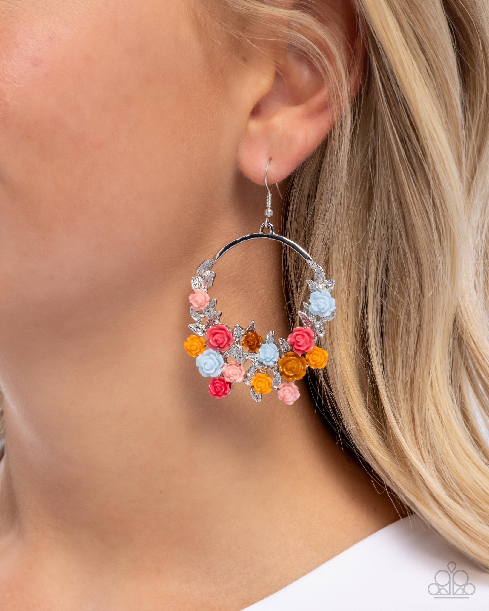 Blooming amongst textured silver leaves, a collection of Desert Rose, light peach, Buckthorn Brown, Winter Sky, and light pink rose acrylics coalesce below the ear from a silver hoop for a floral flair. Earring attaches to a standard fishhook fitting.