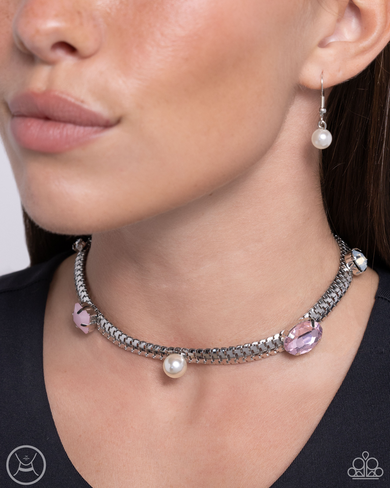Pronged along a thick, abstract silver chain, a collection of multicolored, opalescent, and opaque gems in emerald-cut, round, oval, square, and marquise-cut shapes join a solitaire glossy white pearl around the collar for a classy collection of shimmer and shine. Features an adjustable clasp closure.
