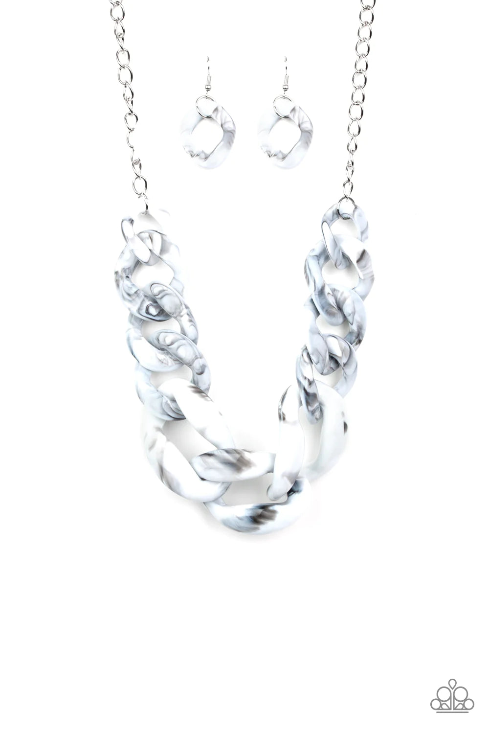 Featuring a faux marble finish, white acrylic links gradually increase in size as they link below the collar in a statement-making fashion. Features an adjustable clasp closure.