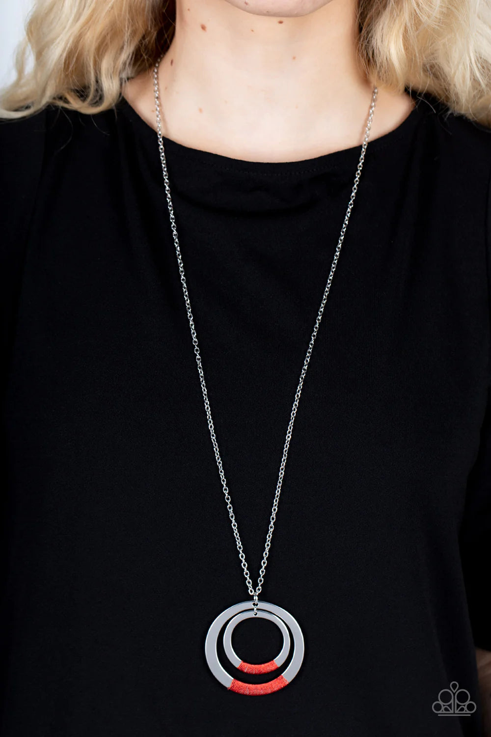Glitzy red thread wraps around the bottoms of two flat silver hoops, creating a dizzying pendant at the bottom of an extended silver chain. Features an adjustable clasp closure.