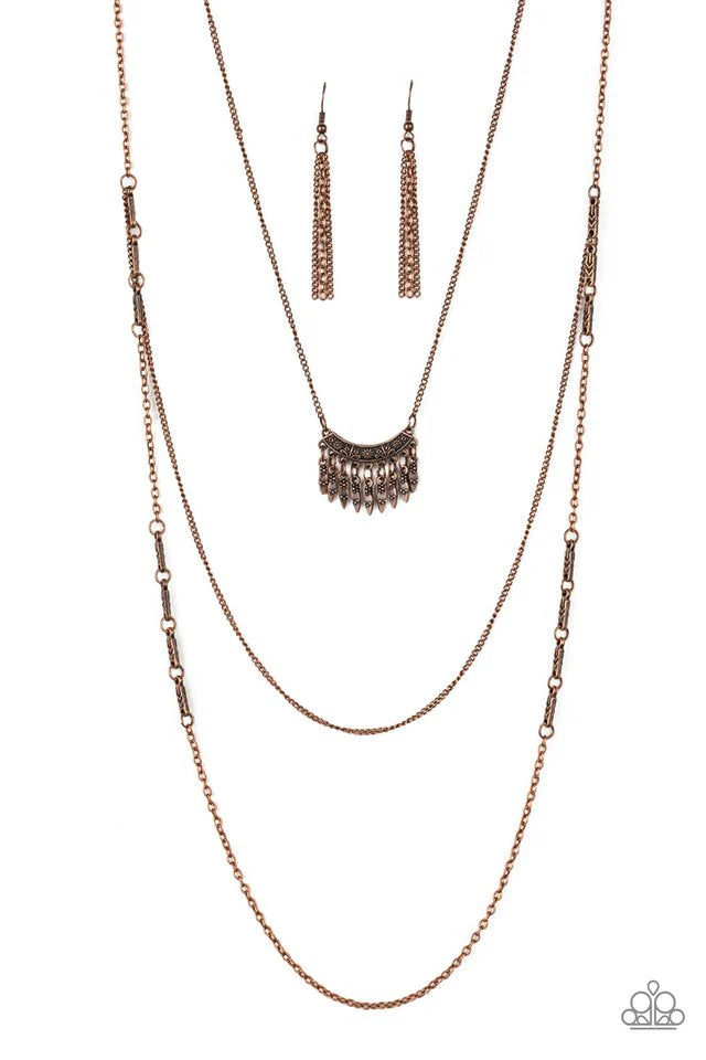 Embossed in a whimsical floral pattern, a fringed frame swings from the uppermost chain above a copper chain featuring dainty copper beading. Infused with a plain chain, the glistening copper chains layer down the chest for a seasonal look. Features an adjustable clasp closure.