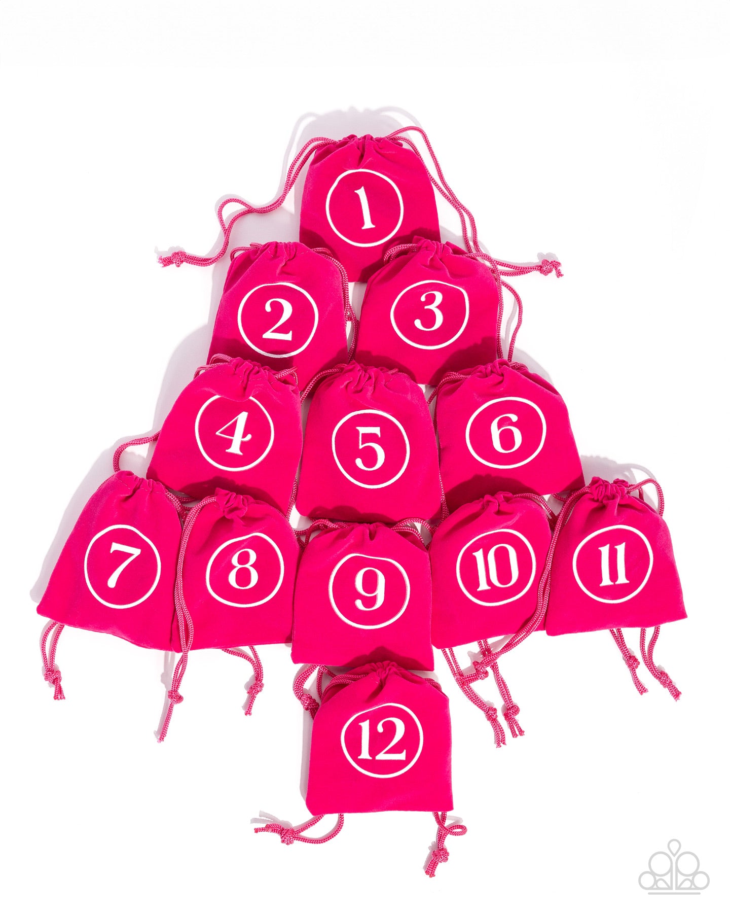 This advent calendar consists of twelve pink velvet bags, each filled with one standard $5 bracelet or pair of earrings. The bags are bundled inside a larger drawstring bag that features the Paparazzi logo. This exclusive advent calendar bundle will only be available for purchase while supplies last when it drops at 12:00 AM ET on Friday, November 8, 2024.