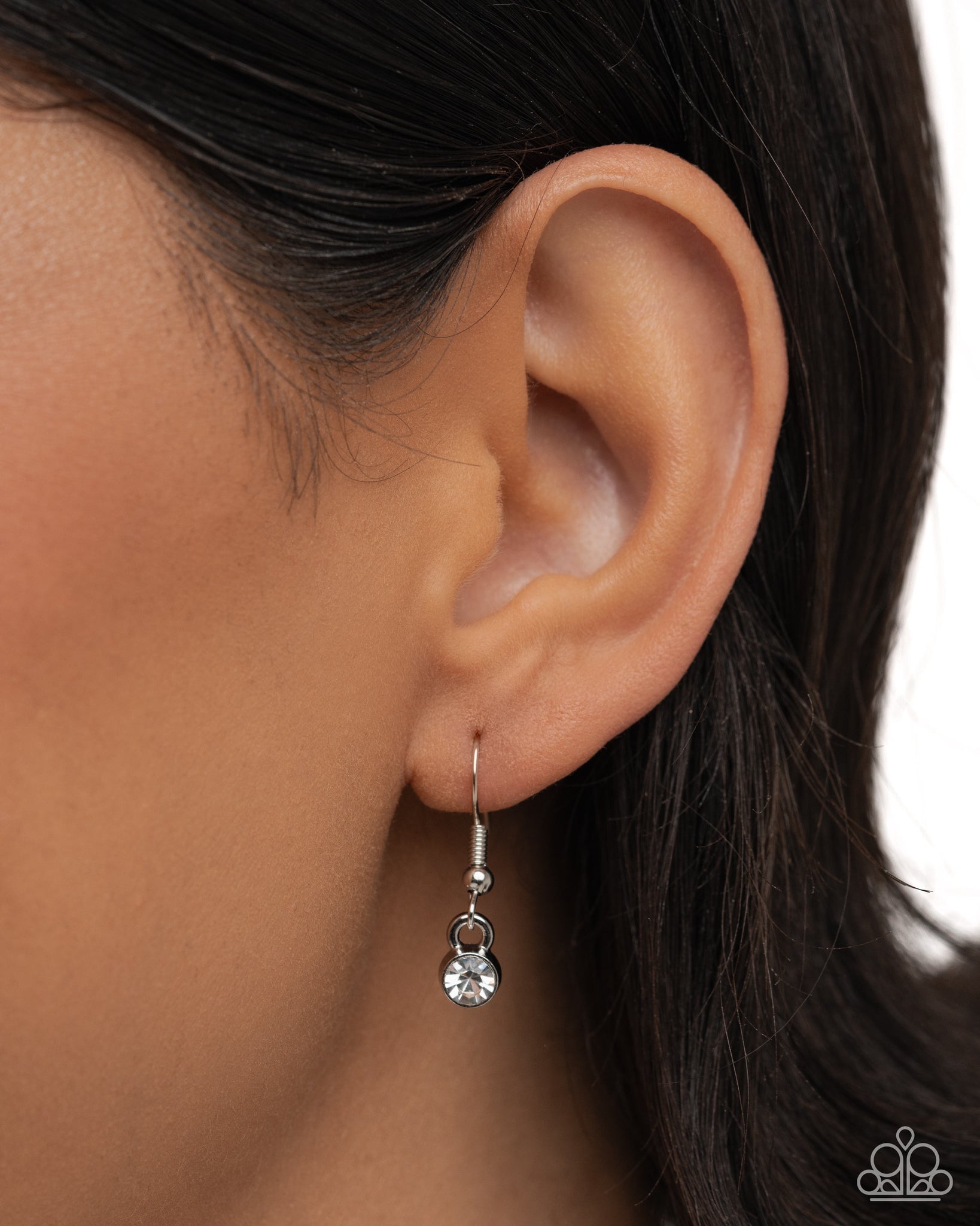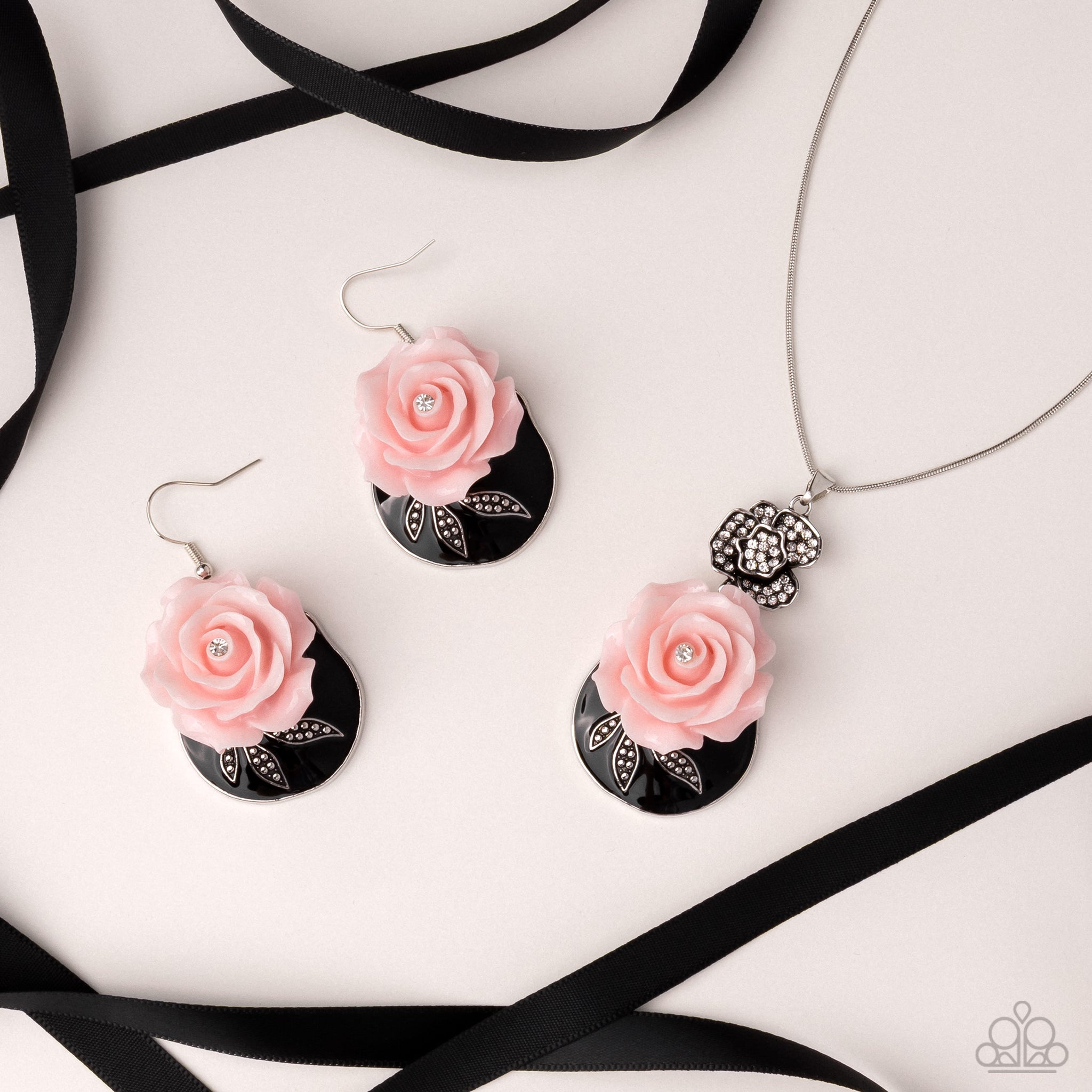 Featuring a solitaire white rhinestone centerpiece, three-dimensional glossy light pink petals bloom in front of a black-painted pendant complete with a trio of textured leaves for an over-the-top whimsical lure. Earring attaches to a standard fishhook fitting.