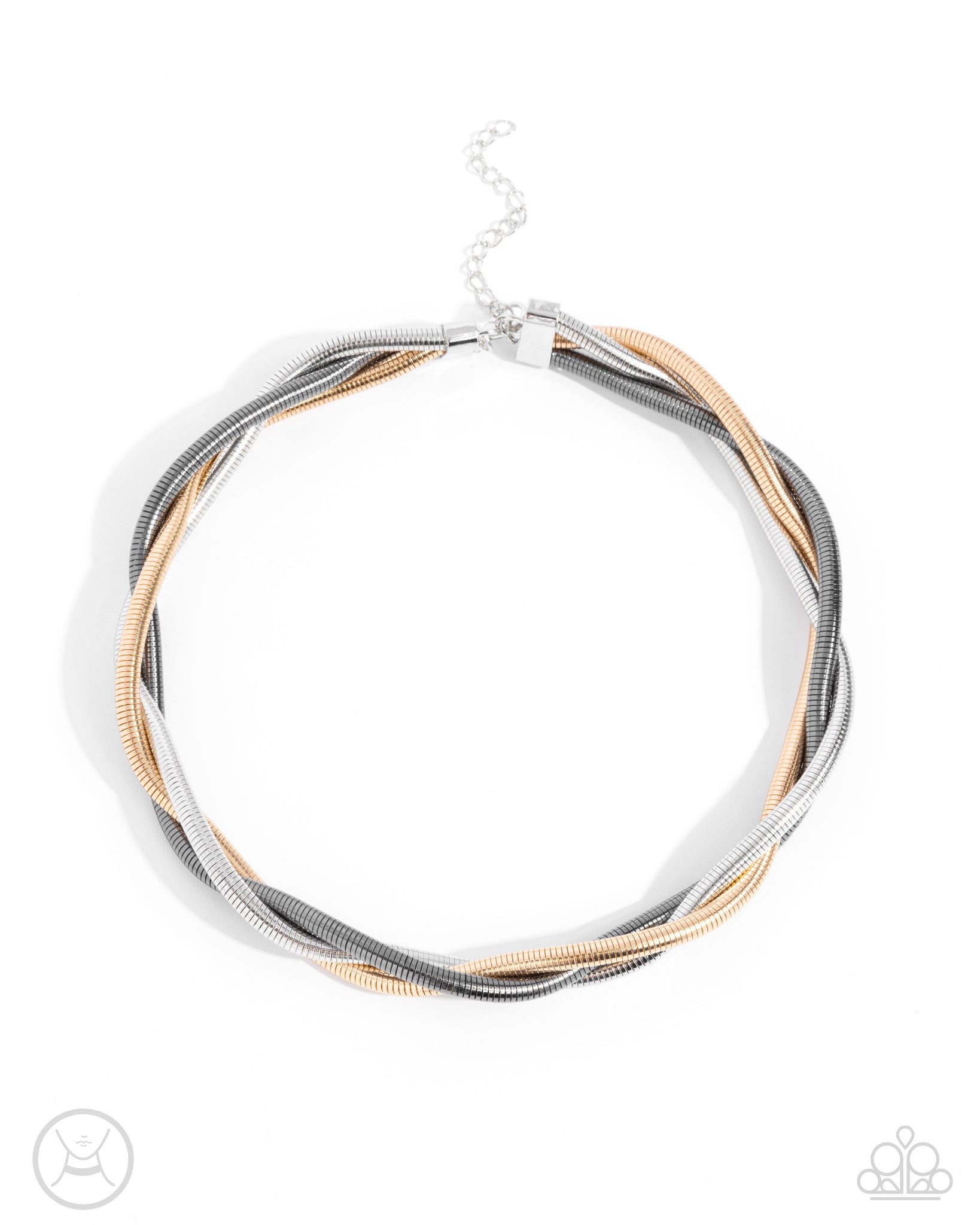 A copious collection of gunmetal, gold, and silver omega chains braid and cascade along the collar for an industrially iconic display. Features an adjustable clasp closure.