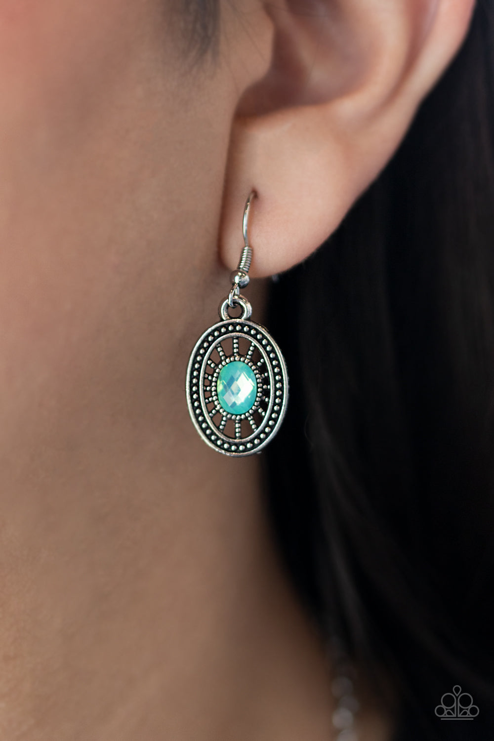 Featuring iridescent green rhinestone centers, a whimsical collection of ornate silver oval frames delicately overlap into a bowing pendant below the collar. Features an adjustable clasp closure.