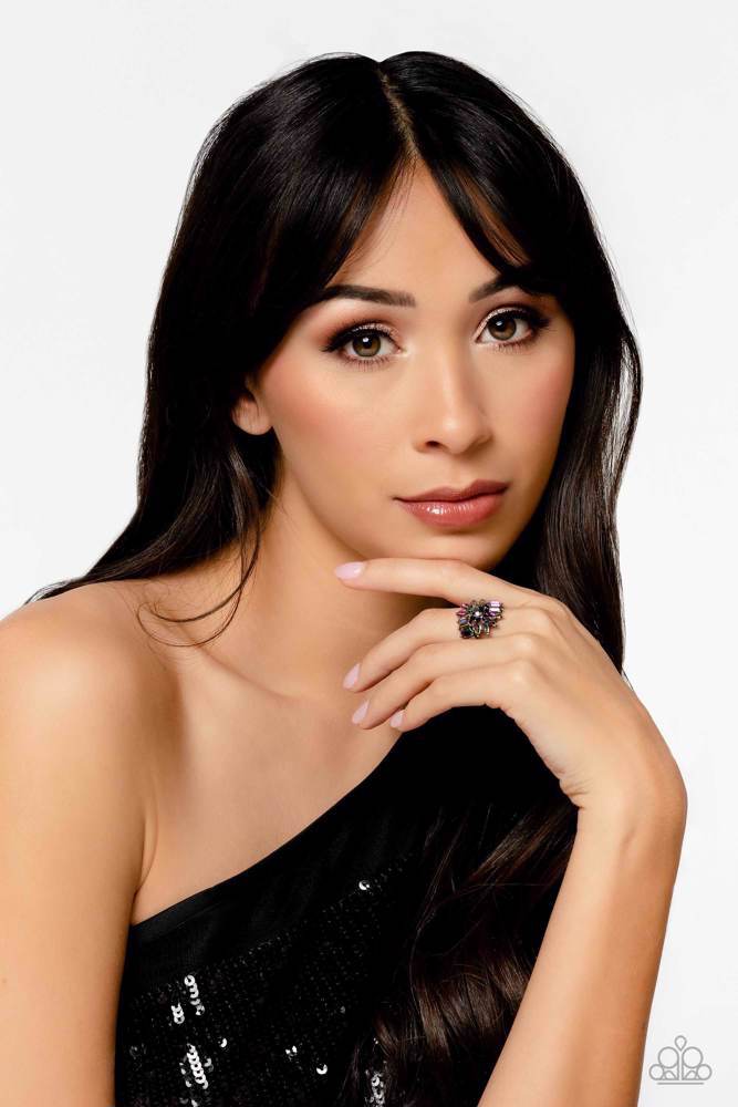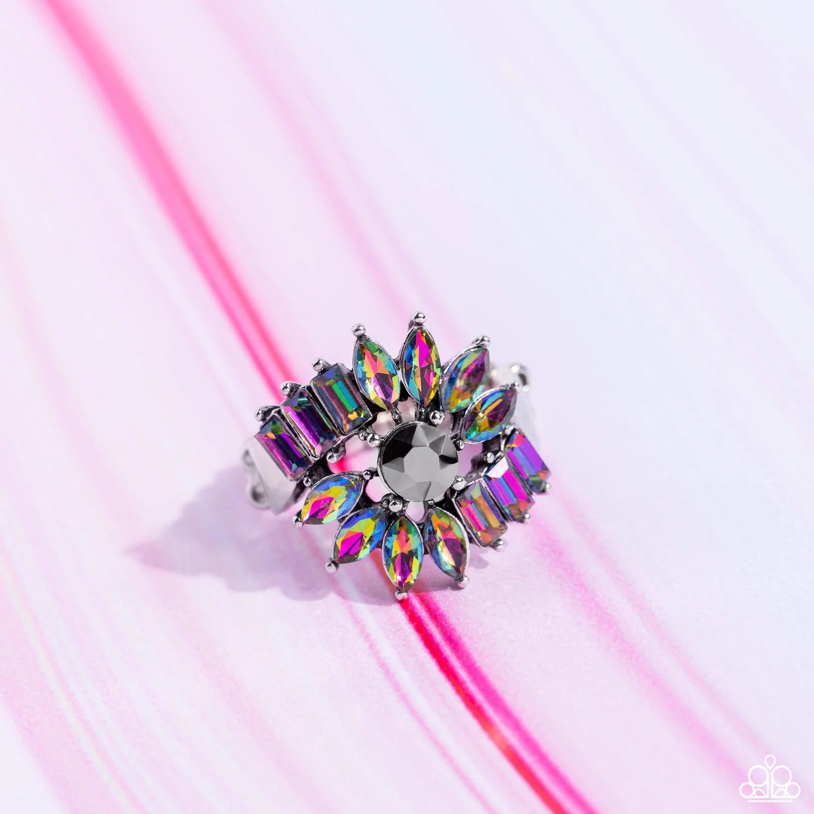 Marquise-cut rhinestone petals, splashed in an oil spill finish, fan out in an abstract manner around a hematite center. Dramatic emerald-cuts, set in a similar oil spill shade, fall in line along twisting bands of silver, exploding into a stellar centerpiece atop the finger. Features a stretchy band for a flexible fit. Due to its prismatic palette, color may vary.